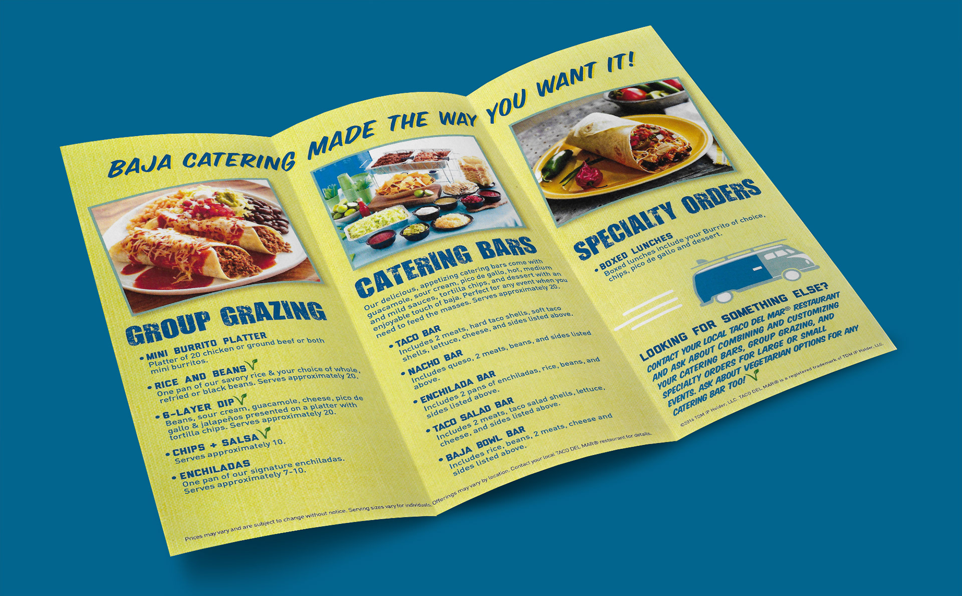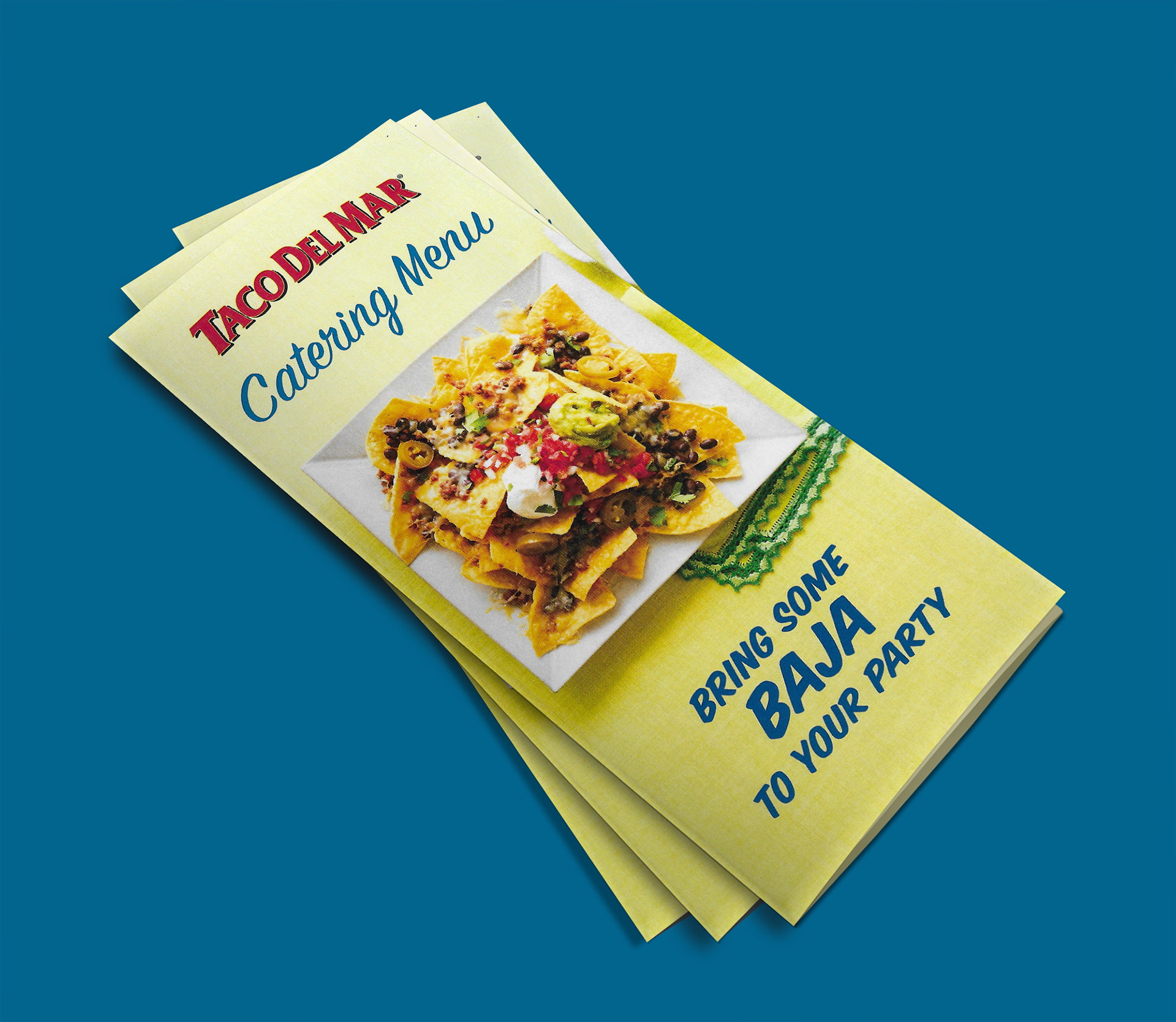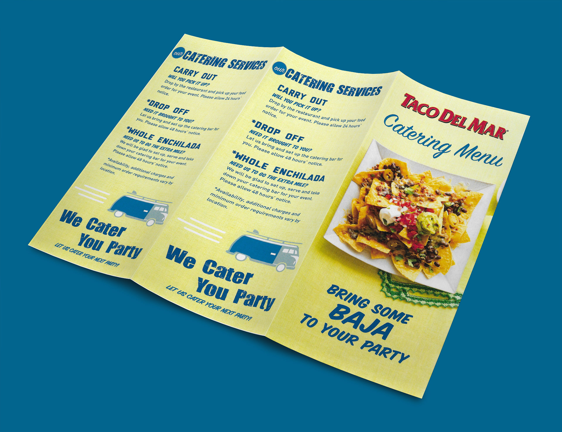 Catering menu brochure that I developed for the Taco Del Mar restaurant franchise. This brochure was printed for all US and Canada locations.